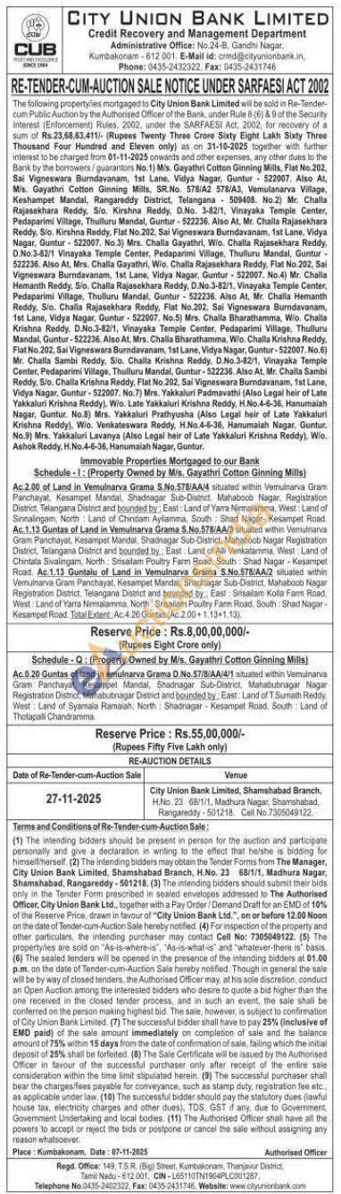 Immovable Properties Mortgaged to our Bank: Schedule-1: (Property Owned by Mis. Gayathri Cotton Ginning Mills)