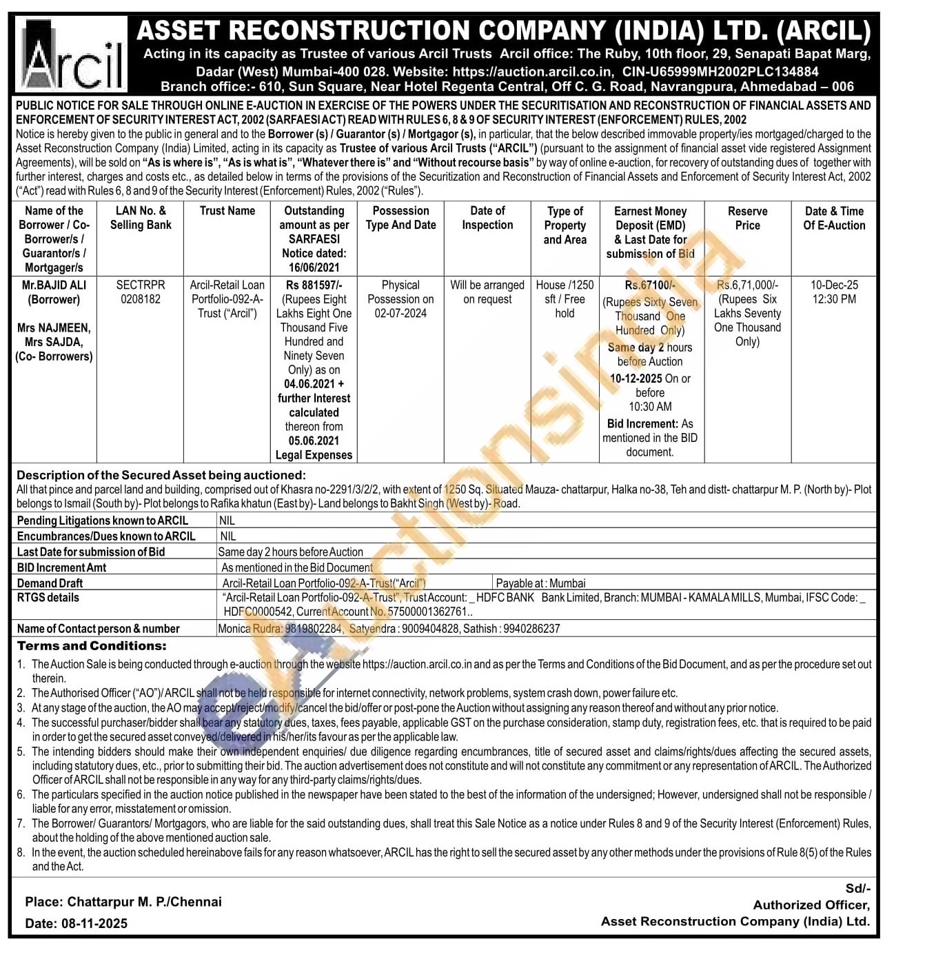 All that pince and parcel land and building, comprised out of Khasra no-2291/3/2/2, with extent of 1250 Sq. Situated Mauza-chattarpur, Halka no-38, Teh and distt-chattarpur M. P. (North by)-Plot belongs to Ismail (South by)- Plot belongs to Rafika khatun (East by)- Land belongs to Bakht Singh (Westby)-Road.