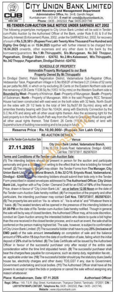 SCHEDULE OF PROPERTY :Immovable Property Mortgaged to our Bank : Property Owned By Mr. Thiruppathi : In Dindigul District, Palani Registration District, Vadamadurai Sub-Registrar Office. Vedasandur Taluk, Paganatham Village in S.No:858/2F of Hectare 0.21.0 Ares of 52 cents as per patta No.866, in which on by excluding 26 Cents on the Eastern Northern side and the remaining of 26 Cents 11336 Sq.fts (1053.14 Sq.mtrs) on the Western Southern side is Bounded by West-Property of Krishnan, East-Property of Murugesan, South-Property of Subramani, North Property of Murugesan, With in the said Property RCC Terraced House had been constructed with east-west on the both sides with 32 feets, North-South on the sides with 29 1/2 feets to the total of 944 Sq.fts (87.69 Sq.mtrs) along with all amenities thereby bearing with Door No. 10/424, along with Electricity Connection by the S.C.No.476 and along with all other usual rights thereon. Also the accessing right for the said property is in the North-South Pathway from the Pudur to Graveyard Road along with all other usual rights thereon. Total Extent: 26 Cents (11336 Sq.feets) of land with Superstructure of building now existing and to be putup in future
