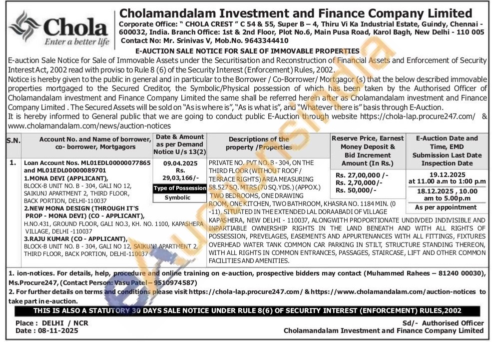 PRIVATE NO. PVT NO. B-304, ON THE THIRD FLOOR (WITHOUT ROOF/TERRACE RIGHTS) AREA MEASURING 58.527 SQ. MTRS (70 SQ.YDS.) (APPOX.) TWO BEDROOMS, ONE DRAWING ROOM, ONE KITCHEN, TWO BATHROOM, KHASRA NO. 1184 ΜΙΝ. (0 -11), SITUATED IN THE EXTENDED LAL DORAABADI OF VILLAGE KAPASHERA, NEW DELHI-110037, ALONGWITH PROPORTIONATE UNDIVDED INDIVISIBLE AND INPARTIABLE OWNERSHIP RIGHTS IN THE LAND BENEATH AND WITH ALL RIGHTS OF POSSESSION, PREVELAGES, EASEMENTS AND APPURTENANCES WITH ALL FITTINGS, FIXTURES OVERHEAD WATER TANK COMMON CAR PARKING IN STILT, STRUCTURE STANDING THEREON, WITH ALL RIGHTS IN COMMON ENTRANCES, PASSAGES, STAIRCASE, LIFT AND OTHER COMMON FACILITIES AND AMENITIES