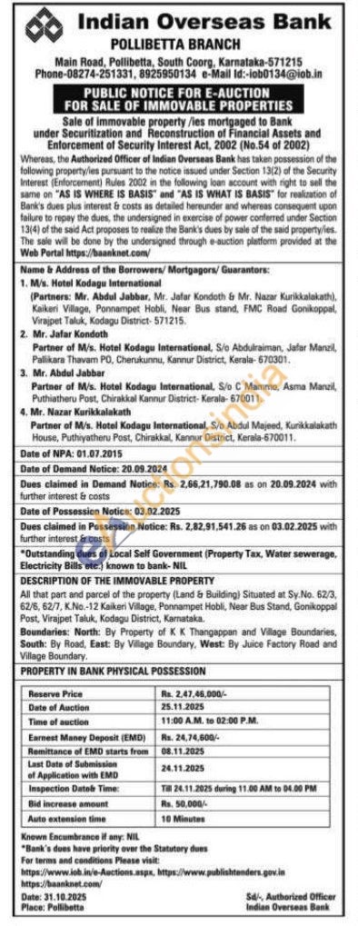 All that part and parcel of the property (Land & Building) Situated at Sy.No. 62/3, 62/6, 62/7, K.No.-12 Kaikeri Village, Ponnampet Hobli, Near Bus Stand, Gonikoppal Post, Virajpet Taluk, Kodagu District, Karnataka.
