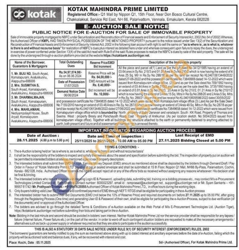 All the piece and parcel of(1) Land as per the gilt deed No 3412/1985 having an extend of 03.64 ares in Sy No. 210/3 and 01.01 Ares in Sy No 210/2 which is now having the extend of 4 Ares 25 Sq. Mtr in Re. Sy No 288/18 as per the land tax receipt No KL04010613449/2022 dated 27-06-2022 and the possession certificate No 73849906 dated 14-12-2022 which were issued from Komalapuram village office, (2) Land as per the Sale deed No 709/1992 having an extend of 03 44 Ares in Sy No 210/2 and land as per the sale deed No. 3735/1993 having extend of 0.81 Ares in Sy No 210/3, 20 Ares in Sy No 210/2, 01.21 Ares in Sy No 210/1/2 which is now having the extend of 3 Ares 15 Sq. Mirs in Re Sy No 288/20 and 2 Ares 5 Sq. Mirs in Re.Sy. No. 288/21 as per the land tax receipt No KL04010609598/2022 dated 30/05/2022 and possession certificate No 73849835 dated 14-12-2022 which were issued from Komalapuram village office (3) Land As per the Sale Deed No 7155/2010 having an extend of 03.48 Ares in Re. Sy. No 287/8 which is now having an extend of 3 Ares 48 Sq. Mtrs in Re.Sy. No 287/8 as per land tax receipt No KL04010613448/2022 dated 27/06/2022 and possession certificate No 73849658 dated 14-12-2022 which were issued from Komalapuram village office which is bounded by: North property of Baby Danavan and varadayini. South KK Road, Property of Thomas and Seema. West: property Bresly and Panchayath Road. East: Property of Anilkumar (As per location sketch. No 5004/2023 issued from komalapuram village office). Together with all buildings and structure attached to the earth or permanently fastened to anything attached to earth, both present and future and all easementary mamool rights annexed thereto.