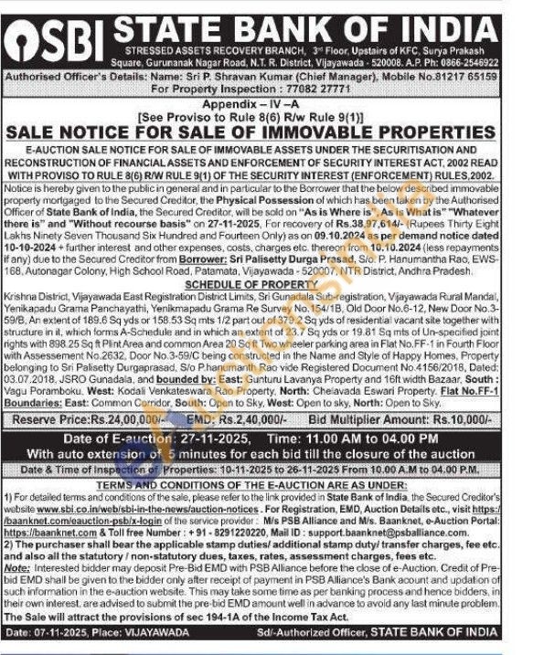 Krishna District, Vijayawada East Registration District Limits, Sri Gunadala Sub-registration, Vijayawada Rural Mandal, Yenikapadu Grama Panchayathi, Yenikmapadu Grama Re Survey No. 154/18, Old Door No.6-12, New Door No.3-59/B, An extent of 189.6 Sq yds or 158.53 Sq mts 1/2 part out of 379.2 Sq yds of residential vacant site together with structure in it, which forms A-Schedule and in which an extent of 23.7 Sq yds or 19.81 Sq mts of Un-specified joint rights with 898.25 Sq ft Plint Area and common Area 20 Sq ft Two wheeler parking area in Flat No.FF-1 in Fourth Floor with Assessement No.2632, Door No.3-59/C being constructed in the Name and Style of Happy Homes, Property belonging to Sri Palisetty Durgaprasad, S/o P.hanumanth Rao vide Registered Document No.4156/2018, Dated: 03.07.2018, JSRO Gunadala, and bounded by: East: Gunturu Lavanya Property and 16ft width Bazaar, South: Vagu Poramboku. West: Kodali Venkateswara Rao Property, North: Chelavada Eswari Property. Flat No.FF-1 Boundaries: East: Common Corridor, South: Open to Sky, West: Open to sky, North: Open to Sky.