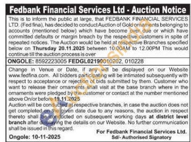 Fedbank Financial Services Ltd Gold Auctions Auction in Ongole