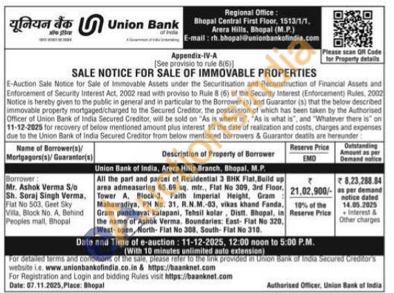 All the part and parcel of Residential 3 BHK Flat, Build up area admeasuring 65.69 sq. mir., Flat No 309, 3rd Floor, Tower A, Block-3, Faith Imperial Height, Gram Mahawadiya, PH No. 31, R.N.M.-03, vikas khand Fanda, Gram panchayat kalapani, Tehsil kolar. Distt. Bhopal, in the name of Ashok Verma. Boundaries: East-Flat No 320. West- open, North- Fiat No 308, South- Flat No 310.