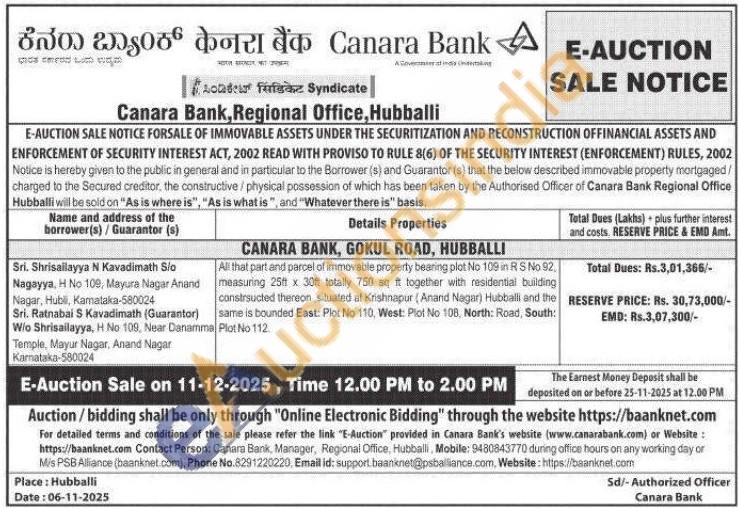 All that part and parcel of immovable property bearing plot No 109 in RS No 92. measuring 25ft x 30ft totally 750 sq ft together with residential building constrsucted thereon situated at Krishnapur (Anand Nagar) Hubballi and the same is bounded East: Plot No 110, West: Plot No 108, North: Road, South: Plot No 112