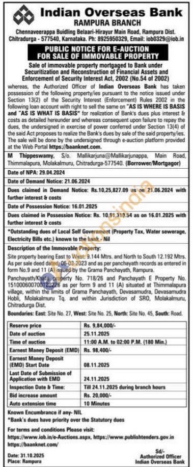 Description of the Immovable Property: Site property bearing East to West: 9.144 Mtrs. and North to South 12.192 Mtrs. As per sale deed dated: 06-03-2023 and as per panchayath records as entered in form No.9 and 11 (A) issued by the Grama Panchayath, Rampura. Panchayathy/Khata property No. 718/26 and Panchayath E Property No. 151000600700120226 as per form 9 and 11 (A) situated at Thimmalapura village, within the limits of Grama Panchayath, Devasamudra, Devasamudra Hobli, Molakalmuru Tq. and within Jurisdiction of SRO, Molakalmuru, Chitradurga Dist.