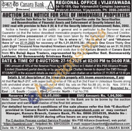 Details & full description of the Immovable property with known encumbrances, if any: All that Flat No.F-217, with super built up area of 786 sq ft in 2nd Floor in Ushodaya Towers along with undivided share of 26 Sq yds out of 4840 Sq, yds on Plot No.88 (A), in Sy. Nos. 311/1 & 311/5, situated at Phase 1, IDA, Jeedimella, Quthbullapur Mandal, R R District Bounded by: East: Lift, South: Corridor, West: Corridor, North: Flat No.218