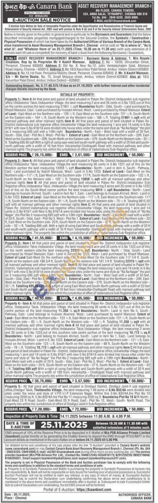 DETAILS OF PROPERTY: Property 2:- Item A: All that piece and parcel of land situated in Palani Re- District, Vedasandur sub registrar office, Vedasandur Taluk, Vedasandur Village,the land measuring 95 cents in S.No 1221 out of this on the Western portion the land measuring 13058 3/4 sqft Boundaries: North:- Land in item II, South Pathway, East:- Land purchased by Kashif Mansoor, West:- Land in S.No 1223. Extent of Land: East-West on the Northern side-117 3/4ft. East-West on the Southern side-117 1/2ft, South-North on the Eastern side-102 ft. South-North on the Western side 120 1/2 ft. Totaling 13058 3/4 sqft with all mamool pathway and other mamool rights Item B: All that piece and parcel of land situated in Palani Re District, Vedasandur Sub Registrar office, Vedasandur Taluk, Vedasandur Village, the land measuring 2 acres and 35 cents in S.No 1222 out of this on the South-West corner portion the land measuring 9815 1/2 sqft Boundaries:- North:- Land belongs to Hussain Ahmed, South:-Land in item No 1. East:-Land belongs to Hussain Ahmed, West:-Land in S.No 1223. Extent of Land:- East-West on the Northern side-117 3/4 ft, East-West on the Southern side-117 1/2 ft, South-North on the Eastern side-91 3/4 ft, South-North on the Western side-75 1/2 ft. Totaling 9815.50 sqft with all mamool pathway and other mamool rights Item C: All that piece and parcel of land situated in Palani Re- District, Vadamadurai sub registrar office, Velvarkottai Village, the land measuring 1 acre and 14 cents in S.No 919/1 with New S.No 919/1A were divided into house sites under the name and style of "Na Na Nagar, the Plot No 2 measuring 695 sqft with a 1/9th right. Boundaries:- North-East-West road with a width of 20 ft, South: Odai, East:- Plot No 3. West:- Plot No 1. Extent of Land:-East-West on the Northern side-20 ft, East-West on the Southern side-20 ft. South-North on the Eastern side-37 ft, South-North on the Western side-32 ft. Totalling 695 sqft. With a right of using East-West and South-North pathway with a width of 20 it and south-north pathway with a width of 16 ft from Velvarkottai- Chettiapatti Road with mamool pathway and other mamool rights. The property lies within the jurisdiction of office of Vadamadurai Sub-Registrar office