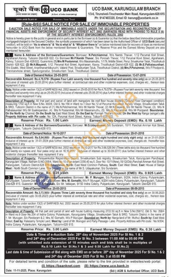 1)All that part and parcel of land with mangalore the roof floor house building (Ground Floor Damaged condition) measuring 1702 sq.ft in Now S. No. 600/8, Old S. No. 156 in Ward no.1 Door No. 12 of Perumal Koil street. Kalvoy Vilage, Srivaikundam Taluk & SRO, Tuticorin District in the name of (1) Ms. N.Patchiammal, Wio Mr. Nambi Thevar, (2) Mr.N Mayandi. Sio Mr Nambi Thevar, (3) Mrs N Pathalasundan Wo Mr Esakkipandlan, (4) Mrs N Poolammal, Wio Mr Masaramuthu, (5) Mrs N Poonammal, Wo Mr Poolpand. Boundaries: On the North by Channel, On the South by East West Street, On the East by Ponian Thevar's House, On the West by Ranga lyengar's site Property Address with Pin code: No 12A, Perumal Kovil Street, Kalvoy Tulicorin-628 622
