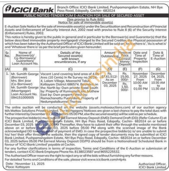 Vacant Land covering land area of 4.05 Ares (10 Cents) In Re Survey no.26/24-4. Lalam Village, Meenachil Taluk, Kottayam District 686574. Bounded on the: North by: Own private Road South by: Property of Kunnumalil jain Mathew East by: Own property West by: Ramachanattu Purayidam, Property of Nedumpalalkunnel Thomas