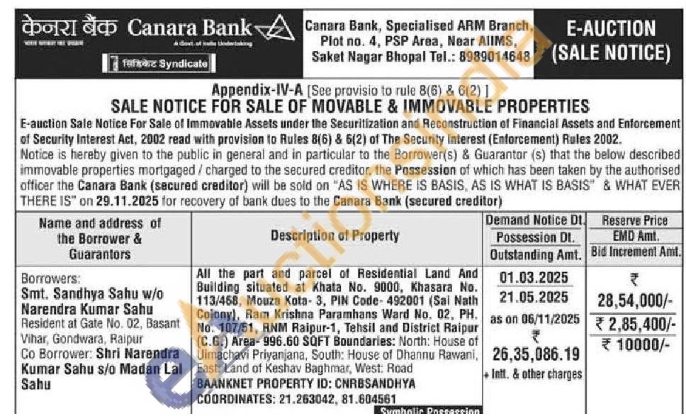 All the part and parcel of Residential Land And Building situated at Khata No. 9000, Khasara No. 113/468, Mouza Kota-3, PIN Code-492001 (Sai Nath Colony), Ram Krishna Paramhans Ward No. 02, PH. No. 107/51, RNM Raipur-1, Tehsil and District Raipur (C.G.) Area-996.60 SQFT Boundaries: North: House of Uimachavi Priyanjana, South: House of Dhannu Rawani, East: Land of Keshav Baghmar, West: Road BAANKNET PROPERTY ID: CNRBSANDHYA COORDINATES: 21.263042, 81.604561