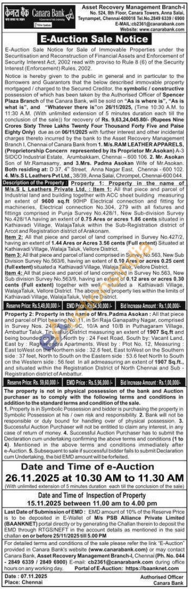Property in the name of M/s.S L. Leathers Private Ltd. Item 1: All that piece and parcel of Industrial land and building together with ACC sheet building measuring an extent of 9600 sq.ft 90HP Electrical connection and fitting for machineries, Electrical connection No.304, 279 with all fixtures and fittings comprised in Punja Survey No.428/1, New Sub-division Survey No. 428/1A having an extent of 0.75 Ares or acres 1.86 cents situated in Kathiavadi Village, Walaja Taluk within the Sub-Registration district of Arcot and Registration district of Arakonam Item 2: All that piece and parcel of land comprised in Survey No.427/2, having an extent of 1.44 Ares or Acres 3.56 cents (Full extent) Situated at Kathiavadi Village, Walaja Taluk, Vellore District. Item 3: All that piece and parcel of land comprised in Survey No. 563. New Sub Division Survey No. 563/6, having an extent of 0.10 Ares or acres 0.25 cent (full extent) situated a Kathiavadi Village, Walaja Taluk, Vellore District Item 4: All that piece and parcel of land comprised in Survey No.563, New Sub division Survey No. 563/9, having an extent of 0.12 ares or acres 0.30 cents (Full extent) together with well, situated a Kathiavadi Village. Walaja Taluk, Vellore District. The above said property lies within the limits of Kathiavadi Village, Walaja Taluk, Vellare District.