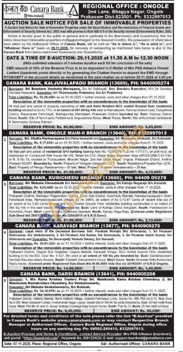 1)All that part and pareal of property consisting of site and Semi finished RCC roofed Ground floor residential building situated at Sy no 7714, in an extent of 451.00 Sq. Yds near to Pamatayarh, Railway Station road, Durgamma Colony, Rayavaram Panchayat, Marikapuram Mandalam, Prakasam District bounded by: East: Railway Station Road South Side of Tammisetty Peddanna & Coguladinne Rasta, West: Rasta, North: Sille of Kunchiala Venikatatah & Tammisetty Venkata Ramam