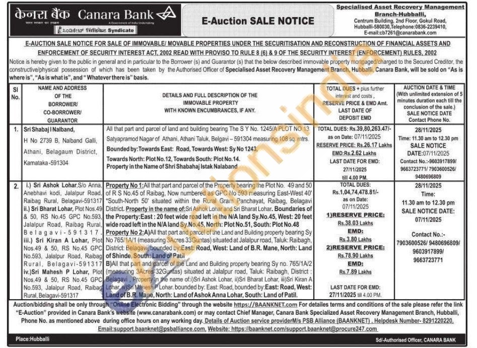 2)Property No 2:A)All that part and parcel of the Land and Building property bearing Sy No 765/1A/1 (measuring 3Acres 33Guntas) situated at Jalalpur road, Taluk: Raibagh, District: Belagavi, bounded by East: Road, West: Land of B.R. Mane, North: Land of Shinde, South: Land of Patil B)All that part and parcel of the Land and Building property bearing Sy no. 765/1A/2 (measuring 3Acres 32Guntas) situated at Jalalpur road, Taluk: Raibagh, District Belagavi, Property in the name of i) Sri Ashok Lohar, ii)Sri Bharat Lohar, iii)Sri Kiran A Lohar, iv)Sri Mahesh P Lohar, bounded by: East: Road, bounded by: East: Road, West: Land of B.R. Mane, North: Land of Ashok Anna Lohar, South: Land
