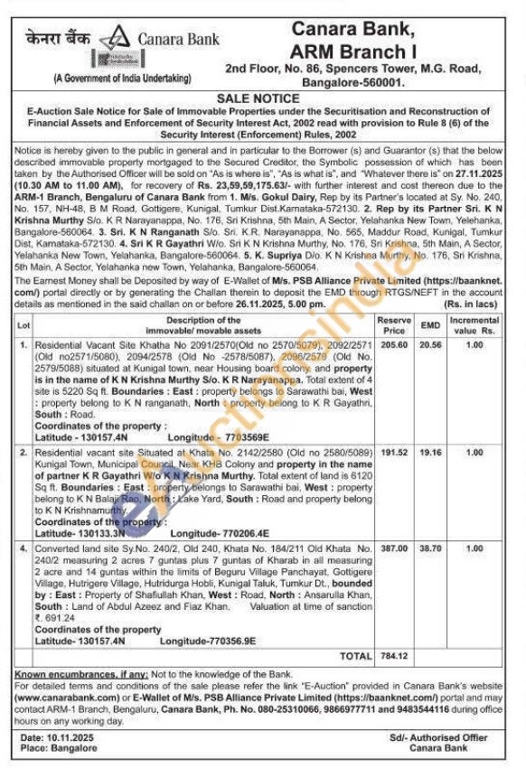 3) Converted land site Sy. No. 240/2, Old 240, Khata No. 184/211 Old Khata No. 240/2 measuring 2 acres 7 guntas plus 7 guntas of Kharab in all measuring 2 acre and 14 guntas within the limits of Beguru Village Panchayat, Gottigere Village, Hutrigere Village, Hutridurga Hobli, Kunigal Taluk, Tumkur Dt., bounded by: East: Property of Shafiullah Khan, West: Road, North: Ansarulla Khan, South: Land of Abdul Azeez and Fiaz Khan, .691.24 Valuation at time of sanction Coordinates of the property Latitude-130157.4N Longitude-770356.9E