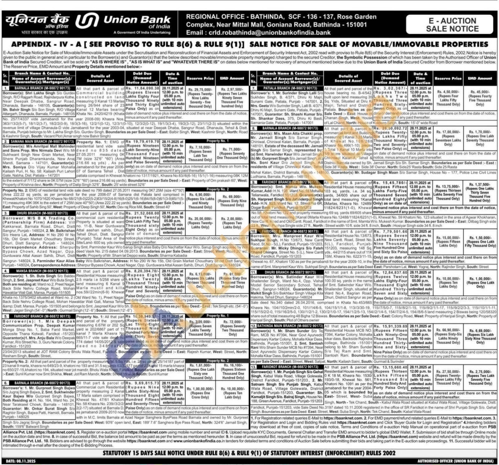 All that part & parcel of Residential House measuring 100.00 sq. yards in the name of Smt. Satwinder Kaur Wio. Shailender Singh, situated at Ward No. 4, Bagrian Road, Dhuri, District Sangrur as per Sale deed No. 340 dated 26.04.2016, comprised in Khata No.453/665 the date of notice, minus amount if any paid thereafter. Khasra No. 104//10/2min/2-0, 101/14/6-5, 104//15/1/1-8, 113//3/30-19, 115/1/7/5/0-7, 115/8/2/1-15 115/9/2/1/1-17, 115//9/2/2/3-3, 115/10/1/1-11 115//15/2/2-0, 115//16/2/5-0, 130//1/2/1-2, 130//2/1/0-17, 154/1/2/5-13, 154//2/1/4-5, 154//7/2/4-5, 154//8/6-5 land measuring 2 Biswas being 120/58320 share out of total measuring 48 Bigha 12 Biswas. Boundaries as per Sale Deed:-East: Colony Road, West: Property of Haripal Singh, North: Property of Haripal Singh, South: Plot of Others owner