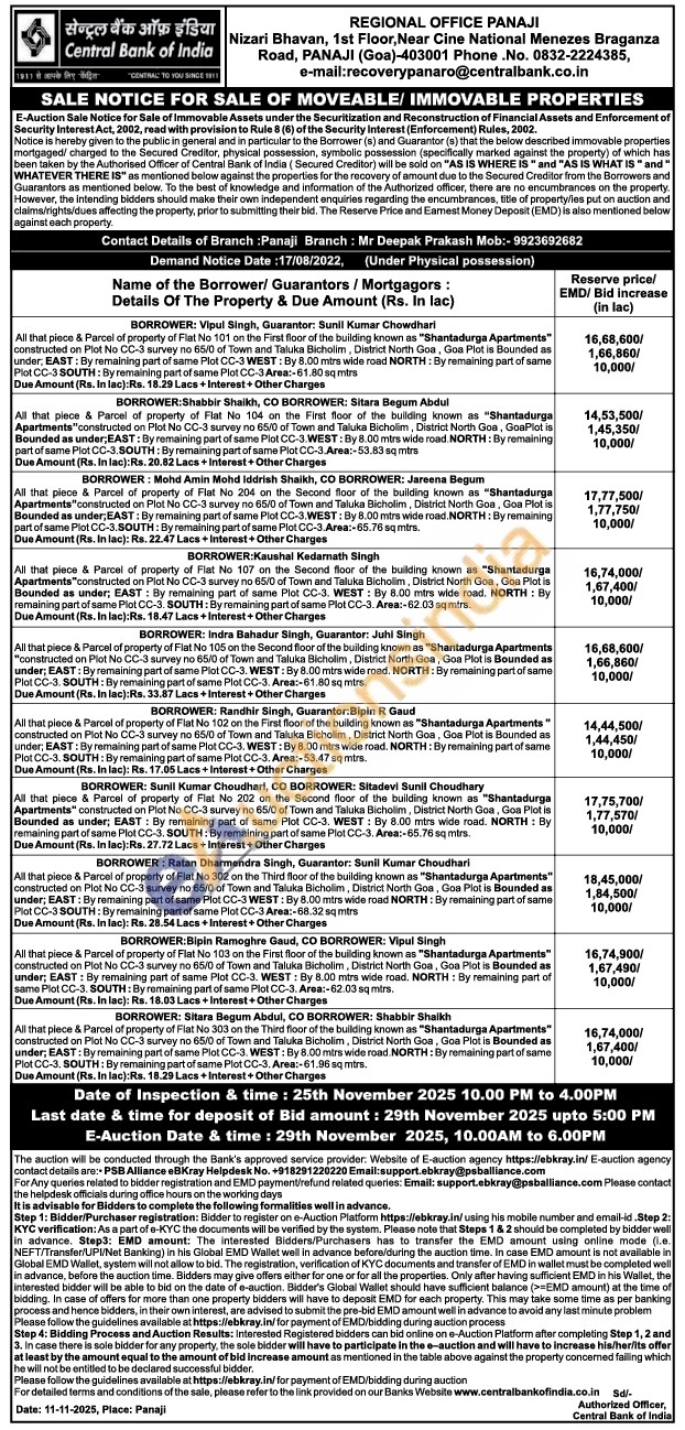 4) All that piece & Parcel of property of Flat No 107 on the Second floor of the building known as "Shantadurga Apartments"constructed on Plot No CC-3 survey no 65/0 of Town and Taluka Bicholim, District North Goa, Goa Plot is Bounded as under; EAST: By remaining part of same Plot CC-3. WEST: By 8.00 mtrs wide road. NORTH: By remaining part of same Plot CC-3. SOUTH: By remaining part of same Plot CC-3. Area:-62.03 sq mtrs. Due Amount (Rs. In lac): Rs. 18.47 Lacs+Interest + Other Charges