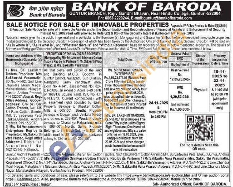 All that piece and parcel of the land and Building (A.C.C. Godown) in Guntur District, Nallapadu Sub Division, Nallapadu Gram Panchayat area, Door No 4-141, assessment No: 824, D.No:606, an extent of Acers 3-49 cents or 16891.6 Square Yards (S.C.No.H.T/G.N.T/273, Cument connections) with ail easement rights bounded by: East: Property Belongs to Bhaskar Cotton Mills is 605-00, South: Property belongs to Duggempudi Venkata Reddy and others is 253-00. West: Property belongs to Chaitanya Palwarizing mills is 596-00", North: Some Property Belongs to Srinivasa Colony is 102', 30' width road is 30', and again srinivasa colony is 124 in total is 256-00