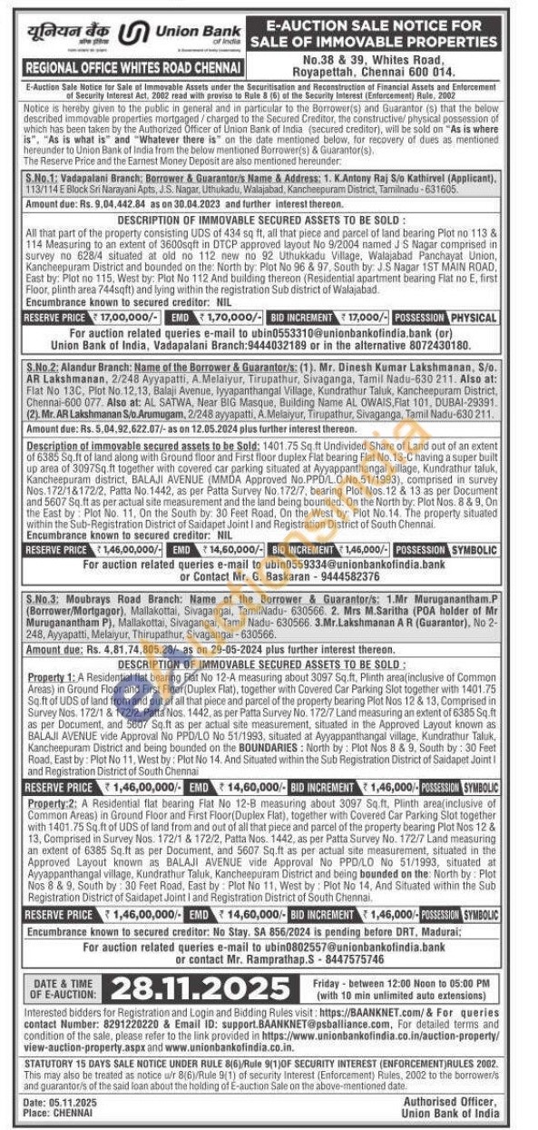 3) Property 2: A Residential flat bearing Flat No 12-8 measuring about 3097 Sq.ft. Plinth area(inclusive of Common Areas) in Ground Floor and First Floor(Duplex Flat), together with Covered Car Parking Slot together with 1401.75 Sq.ft of UDS of land from and out of all that piece and parcel of the property bearing Plot Nos 12 & 13, Comprised in Survey Nos. 172/1 & 172/2, Patta Nos. 1442, as per Patta Survey No. 172/7 Land measuring an extent of 6385 Sq.ft as per Document, and 5607 Sq.ft as per actual site measurement, situated in the Approved Layout known as BALAJI AVENUE vide Approval No PPD/LO No 51/1993, situated at Ayyappanthangal village, Kundrathur Taluk, Kancheepuram District and being bounded on the North by: Plot Nos 8 & 9. South by: 30 Feet Road, East by Plot No 11, West by: Plot No 14, And Situated within the Sub Registration District of Saidapet Joint I and Registration District of South Chennai