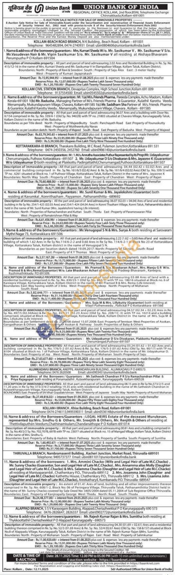 5) All that part and parcel of land admeasuring 2.22 (1.620.60) Ares of land and residential building of which 1.62 Ares in Re Sy No.114/6-2-2 and 0.60 Ares in Re Sy No. 114/6-2-1 in Block No 23 of Kottarakkara Village, Kottarakara Taluk, Kollam district in the name of Venugopal S N. Boundaries as per location sketch dated 19.09.2017: North: Property of Sarojini South: Road East: Property of KY Thomas West: Property of Soman