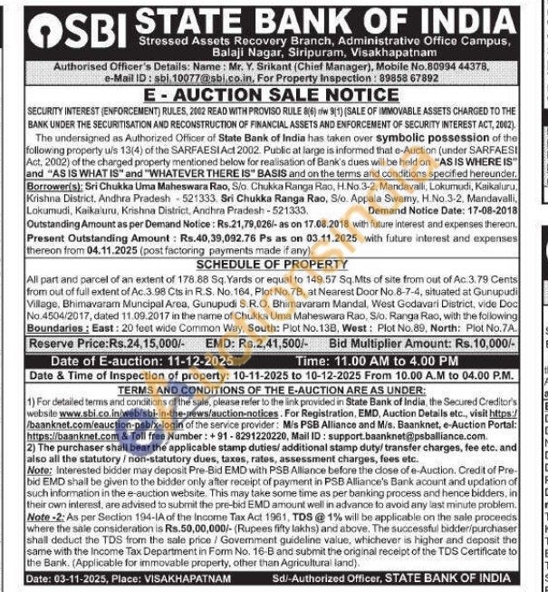 All part and parcel of an extent of 178.88 Sq. Yards or equal to 149.57 Sq.Mts of site from out of Ac. 3.79 Cents from out of fuil extent of Ac.3.98 Cts in R.S. No. 164, Plot No. 7B, at Nearest Door No 8-7-4, situated at Gunupudi Village, Bhimavaram Muncipal Area, Gunupudi S.R.O. Bhimavaram Mandal, West Godavari District, vide Doc No.4504/2017, dated 11.09.2017 in the name of Chukka Uma Maheswara Rao, Sio. Ranga Rao, with the following Boundaries: East: 20 feet wide Common Way, South: Plot No. 138, West: Plot No.89, North: Plot No.7.A.