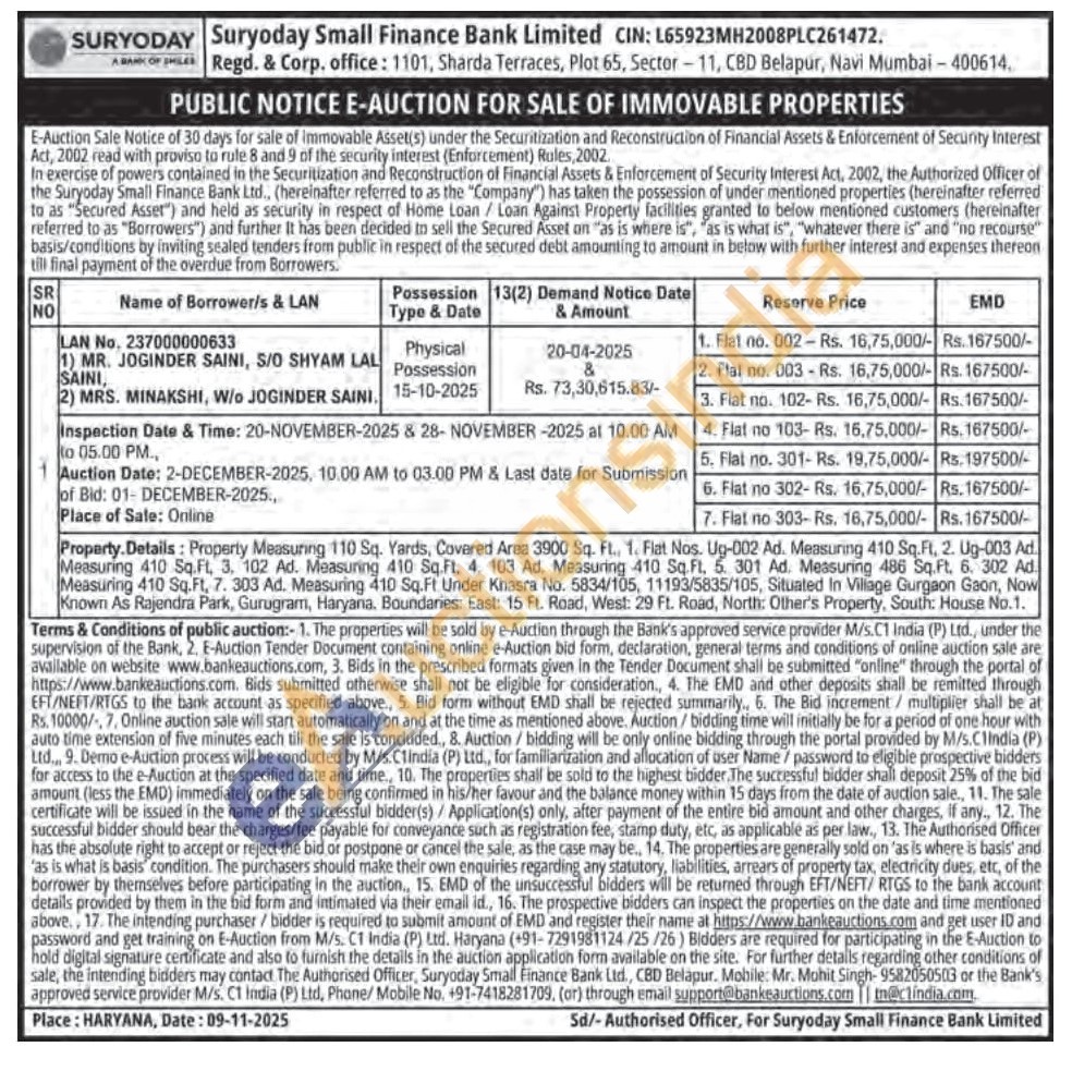 7)Property Measuring 110 Sq. Yards, Covered Area 3900 Sq. Ft., 7. Flat no 303Ad. Measuring 410 Sq.Measuring 410 Sq.Ft Under Khasra No. 5834/105, 11193/5835/105, Situated In Village Gurgaon Gaon, Now Known As Rajendra Park, Gurugram, Haryana, Boundaries: East: 15 Ft. Road, West: 29 Ft. Road, North: Other's Property, South: House No.1.