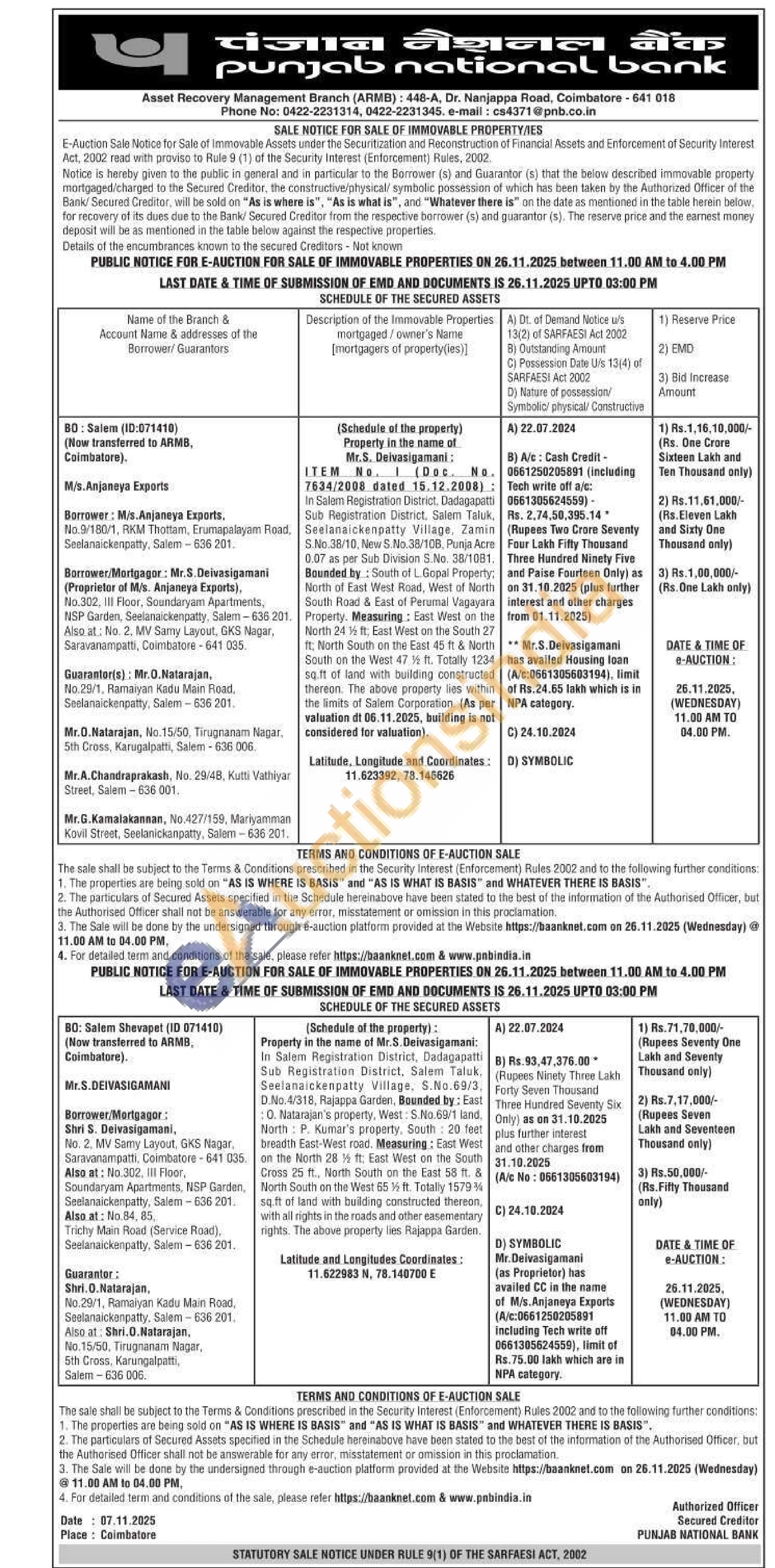 ITEM No. 1 (Doc. No. 7634/2008 dated 15.12.2008): In Salem Registration District, Dadagapatti Sub Registration District, Salem Taluk, Seelanaickenpatty Village, Zamin S.No.38/10, New S.No.38/10B, Punja Acre 0.07 as per Sub Division S.No. 38/1081. Bounded by: South of L. Gopal Property; North of East West Road, West of North South Road & East of Perumal Vagayara Property. Measuring: East West on the North 24 ft: East West on the South 27 ft; North South on the East 45 ft & North South on the West 47 1/½ ft. Totally 1234 sq.ft of land with building constructed thereon. The above property lies within the limits of Salem Corporation. (As per valuation dt 06.11.2025, building is not considered for valuation).