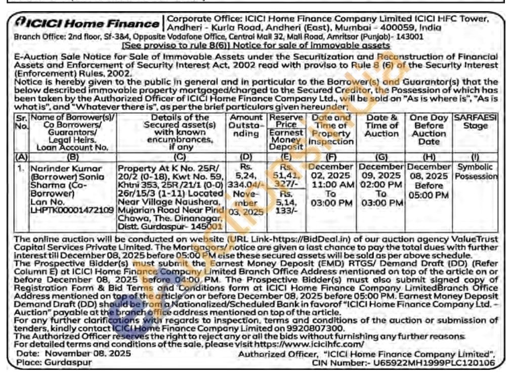 Property At K No. 25R/20/2 (0-18), Kwt No. 59, Khtni 353, 25R/21/1 (0-0) 26г/15/3 (1-11) Located Near Village Naushera, Mujarian Mujarian Roa Road Near Pind ar Pind Chawa, The. Dinanagar, Distt. Gurdaspur-145001