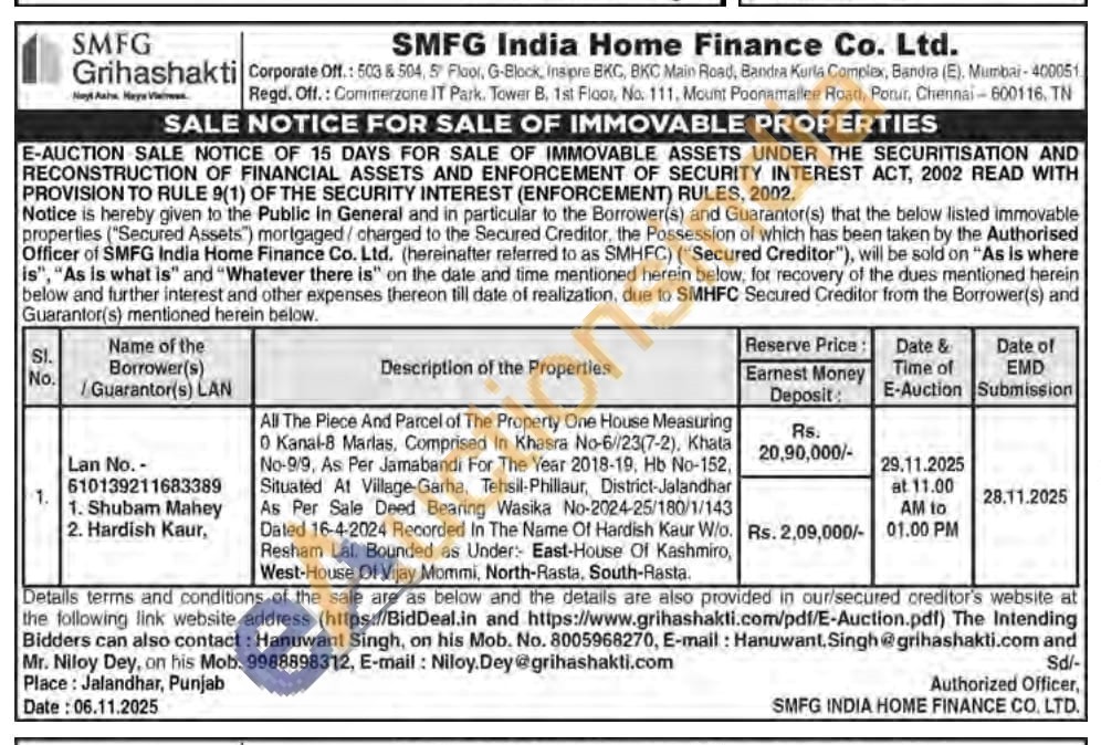 All The Piece And Parcel of The Property One House Measuring 0 Kanal-8 Marlas, Comprised In Khasra No-6//23(7-2), Khata No-9/9, As Per Jamabandi For The Year 2018-19, Hb No-152, Situated At Village-Garha, Tehsil-Phillaur, District-Jalandhar As Per Sale Deed Bearing Wasika No-2024-25/180/1/143 Dated 16-4-2024 Recorded In The Name Of Hardish Kaur W/o. Resham Lal. Bounded as Under: East-House Of Kashmiro, West-House Of Vijay Mommi, North-Rasta, South-Rasta