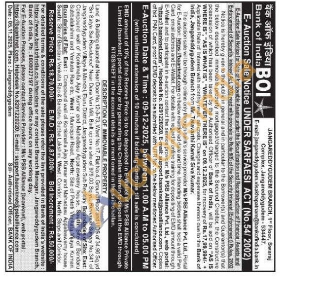 Land & Building situated at Near Door No. 12-3-73, Ward No. 17, Flat No 4, Ground Floor and UDS of 34,96 Sq.yd "Sri Satya Sai Residence" Near Dara Vari Mill, Built up on a site of 979.00 Sq.yd. Revenue Survey No.341 of Jangareddygudem Village & Mandal, Eluru District, Jangareddygudem Sub Registry Boundaries of Site: East: Compound wall of Konkimalla Ajay Kumar and Mahadasu Appalaswamy house, South: Site of Bandaru Subbalakshmi and Venkata Rao etc, West: Municipal Road, North: Site of Peteti Venkata Vijaya Kumari Boundaries of Flat: East: Compound wall of Konkimalla Ajay Kumar and Mahadasu Appalaswamy house, South: Site of Bandaru Venkata Rao & Bandaru Subba Lakshmi, West: Corridor, North: Steps and Corridor.
