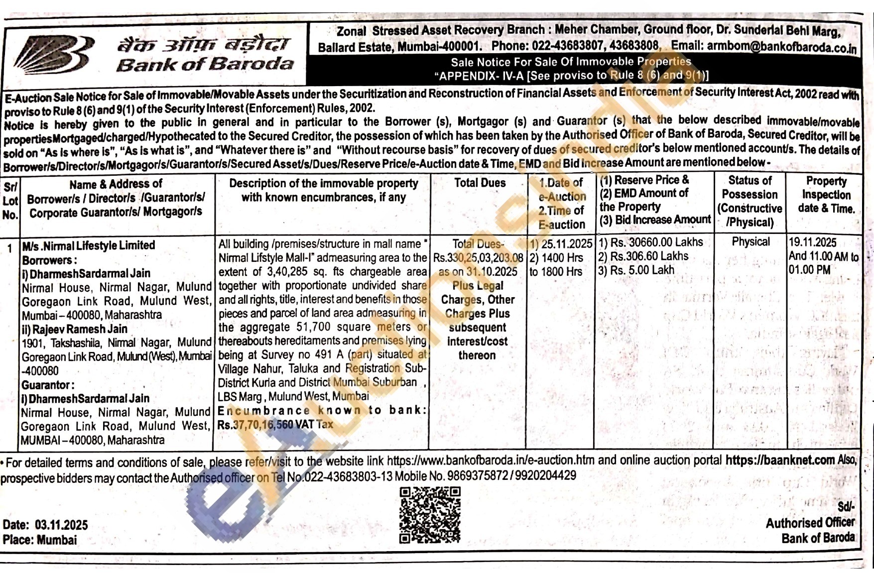 All building/premises/structure in mall name Nirmal Lifstyle Mall-I" admeasuring area to the extent of 3,40,285 sq. fts chargeable area together with proportionate undivided share and all rights, title, interest and benefits in those pieces and parcel of land area admeasuring in the aggregate 51,700 square meters or thereabouts hereditaments and premises lying being at Survey no 491 A (part) situated at Village Nahur, Taluka and Registration Sub-District Kurla and District Mumbai Suburban LBS Marg, Mulund West, Mumbai Encumbrance known to bank: Rs.37,70,16,560 VAT Tax