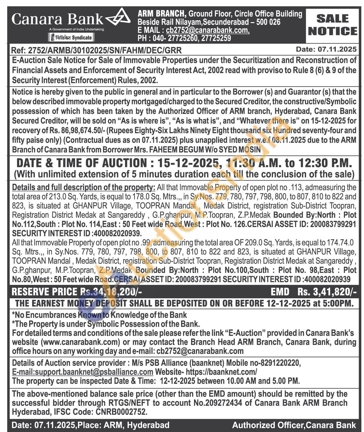 All that Immovable Property of open plot no.113, admeasuring the total area of 213.0 Sq. Yards, is equal to 178.0 Sq. Mtrs.,, in Sy. Nos. 779, 780, 797, 798, 800, to 807, 810 to 822 and 823, is situated at GHANPUR Village, TOOPRAN Mandal, Medak District, registration Sub-District Toopran, Registration District Medak at Sangareddy, G.P.ghanpur, M.P.Toopran, Z.P.Medak Bounded By: North: Plot No.112, South: Plot No. 114, East: 50 Feet wide Road, West: Plot No. 126. CERSAI ASSET ID: 200083799291 SECURITY INTEREST ID: 400082020939. All that Immovable Property of open plot no.99, admeasuring the total area OF 209.0 Sq. Yards, is equal to 174.74.0 Sq. Mtrs.,, in Sy.Nos. 779, 780, 797, 798, 800, to 807, 810 to 822 and 823, is situated at GHANPUR Village, TOOPRAN Mandal, Medak District, registration Sub-District Toopran, Registration District Medak at Sangareddy, G.P.ghanpur, M.P.Toopran, Z.P.Medak Bounded By: North: Plot No.100, South Plot No. 98, East: Plot No.80, West: 50 Feet wide Road. CERSAI ASSET ID: 200083799291 SECURITY INTEREST ID: 400082020939
