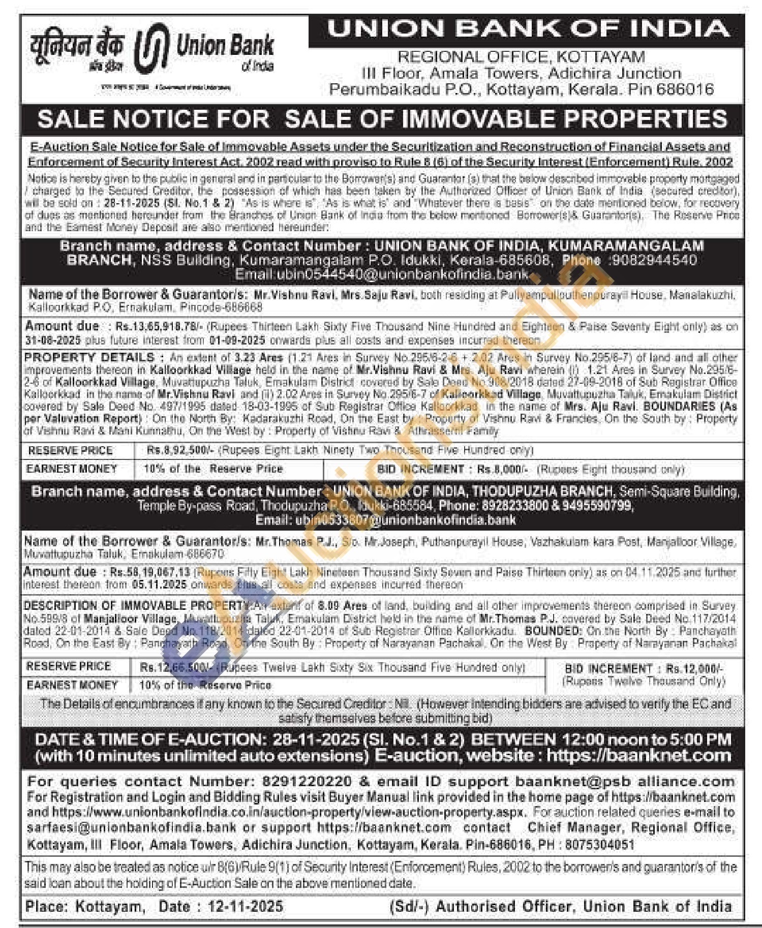 1)An extent of 3.23 Ares (1.21 Ares in Survey No.295/6-2-6+2.02 Ares in Survey No.295/6-7) of land and all other improvements thereon in Kalloorkkad Village held in the name of Mr.Vishnu Ravi & Mrs. Aju Ravi wherein (1) 1.21 Ares in Survey No.295/6-2-6 of Kalloorkkad Village, Muvattupuzha Taluk, Emakulam District covered by Sale Deed No 908/2018 dated 27-09-2018 of Sub Registrar Office Kalloorkkad in the name of Mr.Vishnu Ravi and (ii) 2.02 Ares in Survey No.295/6-7 of Kalloorkkad Village, Muvattupuzha Taluk, Emakulam District covered by Sale Deed No. 497/1995 dated 18-03-1995 of Sub Registrar Office Kalloorkkad in the name of Mrs. Aju Ravi. BOUNDARIES (As per Valuvation Report) On the North By: Kadarakuzhi Road, On the East by Property of Vishnu Ravi & Francies, On the South by: Property of Vishnu Ravi & Mani Kunnathu, On the West by: Property of Vistinu Ravi & Athrasserni Family