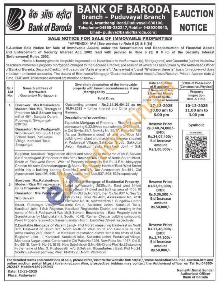 2) 1. Equitable Mortgage of Residential Property-Land admeasuring 2635sq.ft., East west 34feet North South 77.6feet and built up area of 1103.18 Sq Ft in Old Sy.No.93/1, then Sy. No.93/1A, New Sy No.93/1A2, Door No 46/1, Assessment No. 4116 Old Ward No. 10, New ward No. 1, Bungalow Oorani Street, Puduvayal Village, Sakkottai Group, Sakkottai Union, Karaikudi Taluk, Karaikudi Joint -I Sub Registrar, Karaikudi Registration District and standing in the name of Mrs.S.Pushpavalli W/o Mr.S.Selvam. Boundaries: East: Property sold to Sureshkumar by Muthulakshmi, South: K.VE. Raman Chettiar building compound, West: Property retained by Ganeshpandian, North: East-West Street respectively