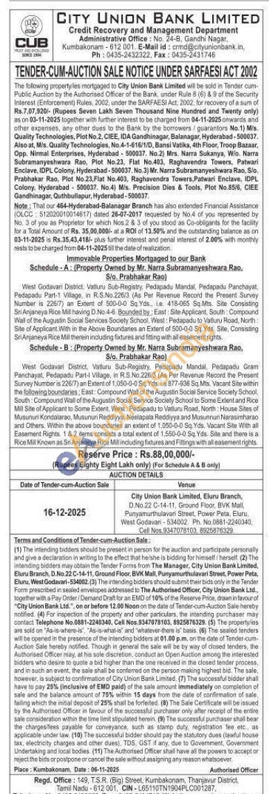 Schedule-B: (Property Owned by Mr. Narra Subramanyeshwara Rao, S/o. Prabhakar Rao) West Godavari District, Vatluru Sub-Registry, Pedapadu Mandal, Pedapadu Gram Panchayat, Pedapadu Part-I Village, in R.S.No.226/3 (As Per Revenue Record the Present Survey Number is 226/7) an Extent of 1,050-0-0 Sq. Yds. Le 877-936 Sq.Mts. Vacant Site within the following boundaries: East: Compound Wall of the Augustin Social Service Society School, South: Compound Wall of the Augustin Social Service Society School to Some Extent and Rice Mill Site of Applicant to Some Extent, West: Pedapadu to Vatluru Road, North: House Sites of Musunuri Kondalarao, Musunuri Reddiyya, Neelapala Reddiyya and Musunnuri Narasimharao and Others. Within the above boundaries an extent of 1,050-0-0 Sq. Yds, Vacant Site With all Easement Rights. 1 & 2 items consists a total extent of 1,550-0-0 Sq. Yds. Site and there is a Rice Mill Known as Sri Anjaneya Rice Mill including fixtures and Fittings with all easement rights