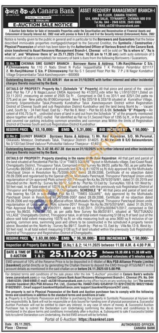 DETAILS OF PROPERTY: Property standing in the name of Mr.Ravi Rajendran: All that part and parcel of the land situated at Residential Plot No. 12 in "TIMES SQUARE" layout in Muttukadu village, East Coast Road, Chengalpattu District, Thirupporur Taluk, Comprised in Old Survey No. 99/20, patta No.793, as per patta New SurveyNo.99/2081.J. of an extent of 4 grounds and 676 sq.ft (10276 sq.ft) duly approved by the Muthukadu Panchayat Union in Resolution No.75/2006-2007 dated 28.09.2006, Certificate of no objection dated 28.09.2006 and regularised by the Special officer, Muttukadu Panchayat. Thiruporur Panchayat Union under regularisation of Un-approved Plots scheme-2017 through Nn.Ka. No.2970/2019/M1, dated 31.05.2019 and bounded on the North by: Survey No.99/17, South by. Plot No. 13 East by: SurveyNos. 100 & 101 West by: 50 feet road, in all Total extent of 10276 sq.ft of land situated with the previously sub Registration District of Thiruporur and Registration District of Chengalpattu SCHEDULE "B" All that piece and parcel of land and villa bearing No.12A in sub-divided Plot No. 12, "TIMES SQUARE, duly approved by the Muthukadu. Panchayat Union in Resolution No. 75/2006-2007 dated 28.09.2006, Certificate of no objection dated 28.09.2006 and regularised by the Special officer, Muttukadu Panchayat. Thiruporur Panchayat Union under regularisation of Un-approved Plots scheme-2017 through Nn Ka No.2970/2019/M1, dated 31.05.2019, Plan Approval Resolution No. 100/2011, dated on 15.02.2011, DTCP/p/0028471/2017, comprised in Old survey No.99/20, Patta No.793, as per patta New Survey No.99/201811, situated at "MUTTUKADU VILLAGE Chengalpattu District, Thirupporur taluk, in all total extent measuring 5138 sq.ft of land (out of the above said total extent measuring 10276 sq.ft) on villa measuring built up area 3600 sq.ft inclusive of car parking, common area, swimming pool and others to be constructed in the scheduled A property herein above, Bounded on the, North by: Survey No. 99/17, South by: Plot no. 13. East by: Villa No. 12-B, West by: 50 feet road. In all total extent measuring 5138 sq.ft of land situated within the previously Sub Registration District of Thirupporur and Registration District of Chengalpattu.