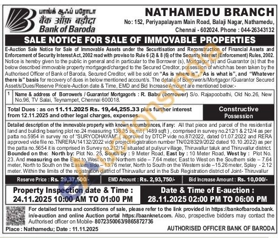 All that piece and parcel of the residential land and building bearing plot no.24 measuring 138.35 sq.mt (1489 sqft), comprised in survey no.212/1 & 212/4 as per patta no.5954 in survey no of "SURYODHAYAM" (approved by DTCP vide no.87/2022, dated 01.07.2022 and RERA approved vide file no. TNRERA/14132/2022 vide project registration number TN/02/8329/2022 dated 10.10.2022) as per the patta no.5654 it is comprised in Survey no.212/14 situated at puliyur village, Thiruvallur taluk and Thiruvallur district Bounded on the: North by: Plot No. 25, South by: 9 Meter Road, East by: 10 Meter Road, West by: Plot No. 23. And measuring on the East to West on the Northem side-7.64 meter, East to West on the Southern side - 7.64 meter, North to South on the Eastem side-13.76 meter, North to South on the Westem side-15.26 meter, Splay -2.12 meter, Within the limits of the registration district of Thiruvallur and in the Sub Registration district of Joint- Thiruvallur