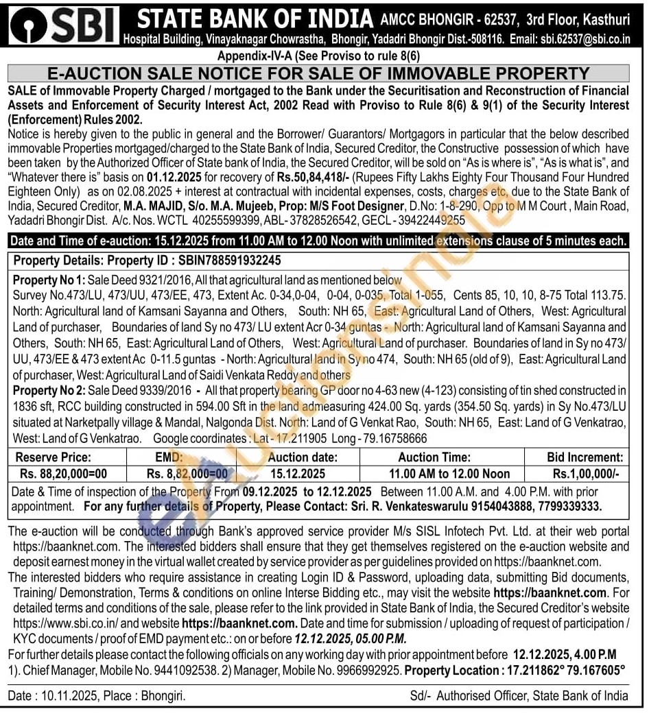 Property No 2: Sale Deed 9339/2016 All that property bearing GP door no 4-63 new (4-123) consisting of tin shed constructed in 1836 sft, RCC building constructed in 594.00 Sft in the land admeasuring 424.00 Sq. yards (354.50 Sq. yards) in Sy No.473/LU situated at Narketpally village & Mandal, Nalgonda Dist. North: Land of G Venkat Rao, South: NH 65, East: Land of G Venkatrao, West: Land of G Venkatrao. Google coordinates: Lat-17.211905 Long-79.16758666
