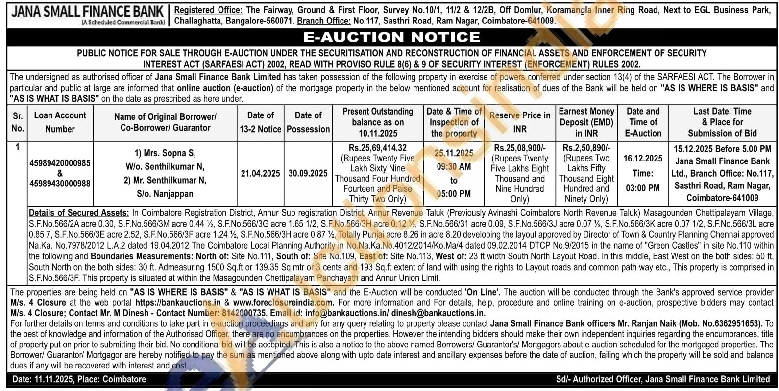 Details of Secured Assets: In Coimbatore Registration District, Annur Sub registration District, Annur Revenue Taluk (Previously Avinashi Coimbatore North Revenue Taluk) Masagounden Chettipalayam Village, S.F.No.566/2A acre 0.30, S.F.No.566/3M acre 0.44½, S.F.No.566/3G acre 1.65 1/2, S.F.No.566/3H acre 0.12 ½, S.F.No.566/31 acre 0.09, S.F.No.566/3J acre 0.07 1/2, S.F.No.566/3K acre 0.07 1/2, S.F.No.566/3L acre 0.85 7, S.F.No.566/3E acre 2.52, S.F.No.566/3F acre 1.24 1/2, S.F.No.566/3H acre 0.87 1/2, Totally Punjai acre 8.26 in acre 8.20 developing the layout approved by Director of Town & Country Planning Chennai approved Na.Ka. No.7978/2012 L.A.2 dated 19.04.2012 The Coimbatore Local Planning Authority in No.Na.Ka.No.4012/2014/Ko. Ma/4 dated 09.02.2014 DTCP No.9/2015 in the name of "Green Castles" in site No.110 within the following and Boundaries Measurements: North of: Site No.111, South of: Site No.109, East of: Site No. 113, West of: 23 ft width South North Layout Road. In this middle, East West on the both sides: 50 ft, South North on the both sides: 30 ft. Admeasuring 1500 Sq.ft or 139.35 Sq.mtr or 3 cents and 193 Sq.ft extent of land with using the rights to Layout roads and common path way etc.. This property is comprised in S.F.No.566/3F. This property is situated at within the Masagounden Chettipalayam Panchayath and Annur Union Limit