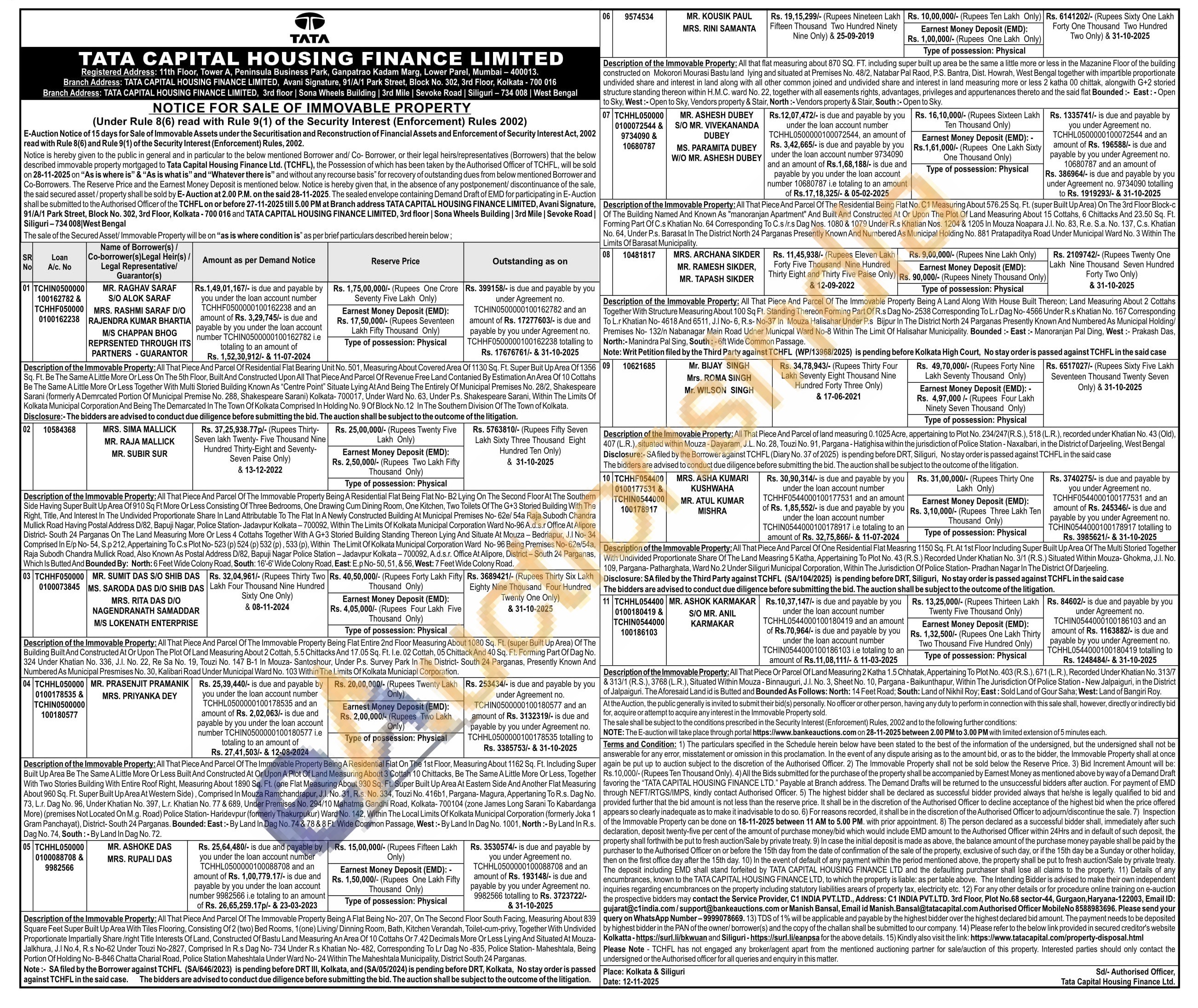 All That Piece And Parcel of land measuring 0.1025 Acre, appertaining to Plot No. 234/247(R.S.), 518 (L.R.), recorded under Khatian No. 43 (Old), 407 (L.R.), situated within Mouza-Dayaram, J.L. No. 28, Touzi No. 91, Pargana-Hatighisa within the jurisdiction of Police Station - Naxalbari, in the District of Darjeeling, West Bengal Disclosure:-SA filed by the Borrower against TCHFL (Diary No. 37 of 2025) is pending before DRT, Siliguri, No stay order is passed against TCHFL in the said case The bidders are advised to conduct due diligence before submitting the bid. The auction shall be subject to the outcome of the litigation