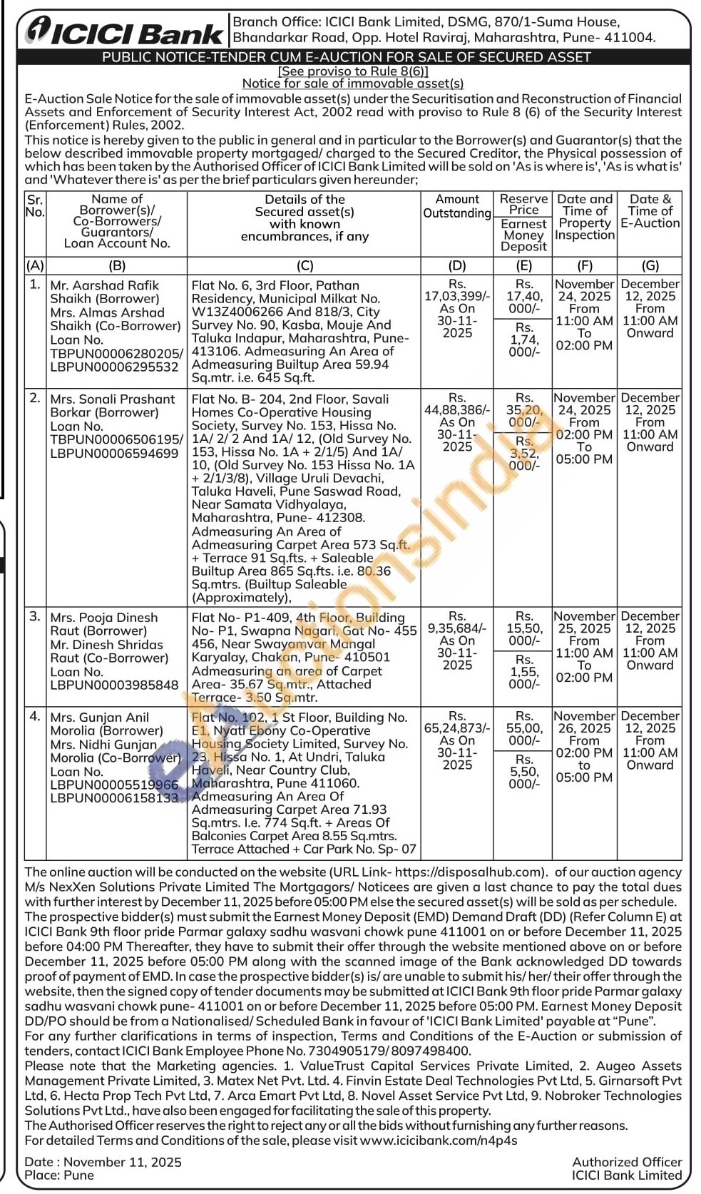 Flat No- P1-409, 4th Floor, Building No- P1, Swapna Nagari, Gat No-455 456, Near Swayamvar Mangal Karyalay, Chakan, Pune- 410501 Admeasuring an area of Carpet Area-35.67 Sq.mtr., Attached Terrace- 3.50 Sq.mtr