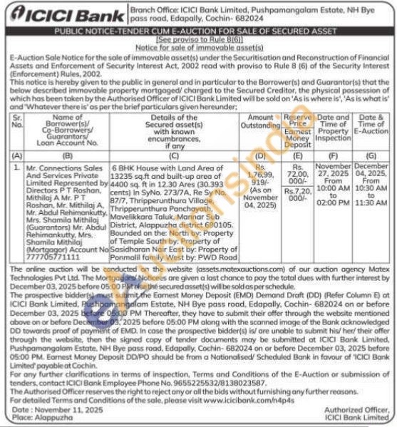 6 BHK House with Land Area of 13235 sq.ft and built-up area of 4400 sq. ft in 12.30 Ares (30.393 cents) in SyNo. 273/7A, Re Sy No. 87/7, Thripperunthura Villoge, Thripperunthura Panchayath, Mavelikkara Taluk, Mannar Sub District, Alappuzha district 690105. Bounded on the: North by: Property of Temple South by: Property of Sasidharan Nair East by: Property of Ponmalil family West by: PWD Road