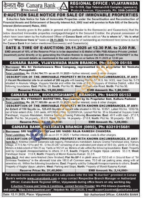 3) Krishna District, patamata sub registry, Penamaluru mandalam, kanuru Grama Panchayat area, Kanuru Village, in R.S.No 15/1a and 16. D.No.20-247 consisting of an undivided joint share of 30.0 Sq. yards or 25.08 sq. Meters in total extent of 194.25 sq. Yards or 16241 sq. Meters of site within the following boundaries East: Property sold by Gollapalli Annapoornamma to others 31.6 ft. South: Property of Kagita Vijaya Lakshmi 55.3 ft. West: Panchayat Bazar 31.6 ft, North: Property of Mondi Kusuma Kuman 55.3 1. Item No.: And also semi-finished (Now finished) Flat No.GF-1 in plinth area of 720.0 sit in Ground floor of "Sri Srinivasa Residency in the aforesaid total site 180.0 sft Common area, 70.0 sft car parking area, along with all amenities etc. Within the following boundaries: East: Property sold by Gollapalli Annapoonamma to others. South: Property of Kagita Vijaya Lakshmi, West: Parking and Steps, North: Property of Mondi Kusuma Kumari