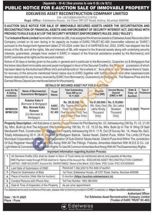 Property Description :-All that piece or parcel of Land Known As Plot Bearing No. 03, Admeasuring 236 Sq. Ft. I.E. 21.93 Sq. Mtrs. Built-Up And The Adjacent Otta Admeasuring 165 Sq. Ft. I.E. 15.33 Sq. Mtrs. Built-Up In The 'A' Wing Of Said Manibandh Park, Constructed On The Landed Property Admeasuring 00 H. 11 R, Out Of Survey No. 14, Hissa No. 6a/2, Totally Admeasuring 00 H. 26 R, Situated At Wadgaon Badruk, Taluka Haveli, District Pune, Within The Limits Of Pune Municipal Corporation And Within The Registration Of Sub-District Taluka Haveli, District Pune And Within The Jurisdiction Of Sub Registrar Haveli. The Said Shop Along With All The Fittings, Fixtures, Amenities Attached With M.S.E.D Co. Ltd. Light Meter & Connection & Along With Rights To Use All Common Amenities And Along With All The Easementary Rights