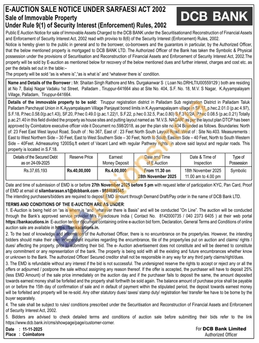 Details of the immovable property to be sold: Tiruppur registration district in Palladam Sub registration District in Palladam Taluk