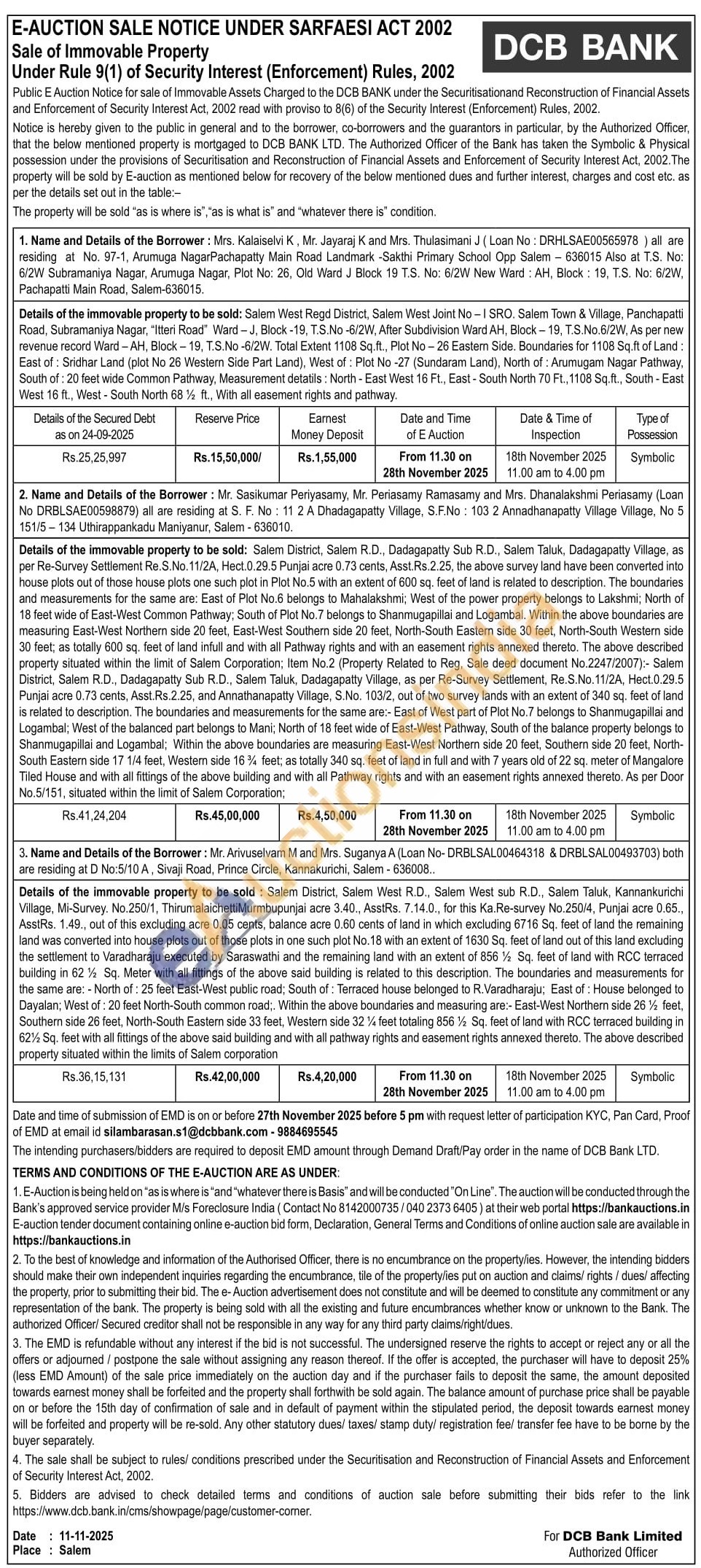 Details of the immovable property to be sold: Salem West Regd District, Salem West Joint No-I SRO. Salem Town & Village, Panchapatti Road, Subramaniya Nagar, "Itteri Road" Ward-J, Block-19, T.S.No -6/2W, After Subdivision Ward AH, Block-19, T.S.No.6/2W, As per new revenue record Ward -AH, Block-19, T.S.No -6/2W. Total Extent 1108 Sq.ft., Plot No-26 Eastern Side. Boundaries for 1108 Sq.ft of Land: East of: Sridhar Land (plot No 26 Western Side Part Land), West of: Plot No -27 (Sundaram Land), North of: Arumugam Nagar Pathway, South of: 20 feet wide Common Pathway, Measurement detatils: North - East West 16 Ft., East - South North 70 Ft., 1108 Sq.ft., South-East West 16 ft., West - South North 68 1/2 ft., With all easement rights and pathway