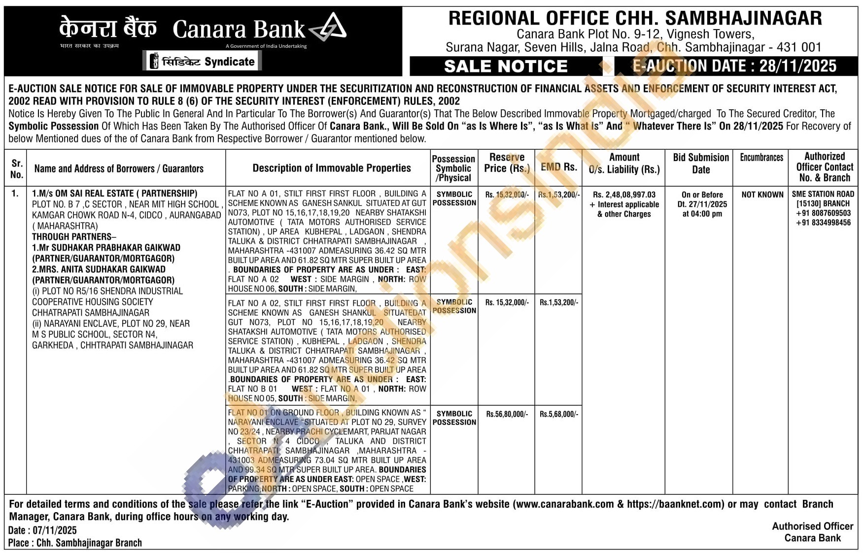 FLAT NO 01 ON GROUND FLOOR, BUILDING KNOWN AS " NARAYANI ENCLAVE "SITUATED AT PLOT NO 29, SURVEY NO 23/24, NEARBY PRACHI CYCLEMART, PARIJAT NAGAR SECTOR N 4 CIDCO TALUKA AND DISTRICT CHHATRAPATI SAMBHAJINAGAR MAHARASHTRA 431003 ADMEASURING 73.04 SQ MTR BUILT UP AREA AND 99.34 SQ MTR SUPER BUILT UP AREA. BOUNDARIES OF PROPERTY ARE AS UNDER EAST: OPEN SPACE, WEST: PARKING, NORTH: OPEN SPACE, SOUTH: OPEN SPACE