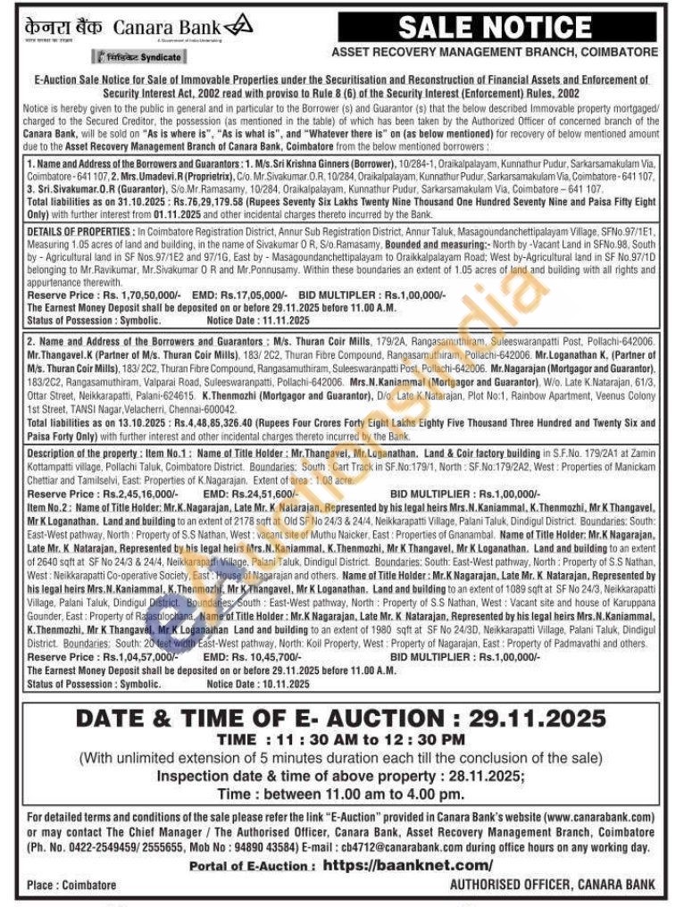 2) Item No.1: Name of Title Holder: Mr. Thangavel, Mr. Loganathan. Land & Coir factory building in S.F.No. 179/2A1 at Zamin Kottampatti village, Pollachi Taluk, Coimbatore District. Boundaries: South: Cart Track in SF.No:179/1, North: SF.No:179/2A2, West: Properties of Manickam Chettiar and Tamilselvi, East: Properties of K. Nagarajan. Extent of area: 1.08 acre