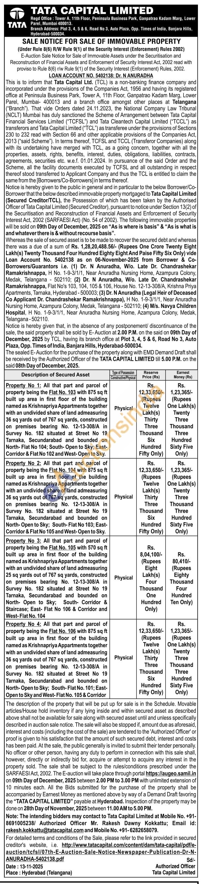 Property No 3: All that part and parcel of property being the Flat No. 105 with 570 sq ft built up area in first floor of the building named as Krishnapriya Appartments together with an undivided share of land admeasuring 25 sq yards out of 767 sq yards, constructed on premises bearing No. 12-13-308/A in Survey No. 182 situated at Street No 19 Tarnaka, Secundarabad and bounded on North Open to Sky; South Corridor & Staircase; East- Flat No 106 & Corridor and West-Flat No. 104